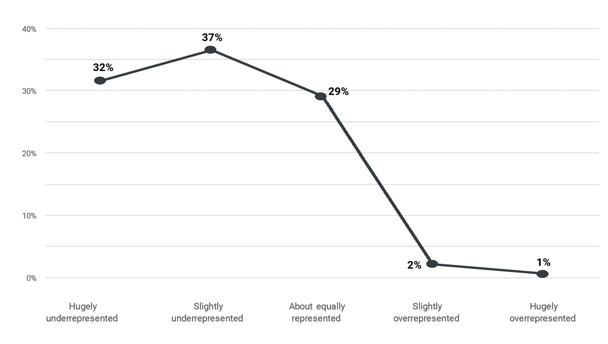 Interestingly, respondents see cultural/ethnic minorities as better represented in corporate roles in the agriculture industry than women. Whilst 69% still think they are under represented, 29% believe they are about equally represented.