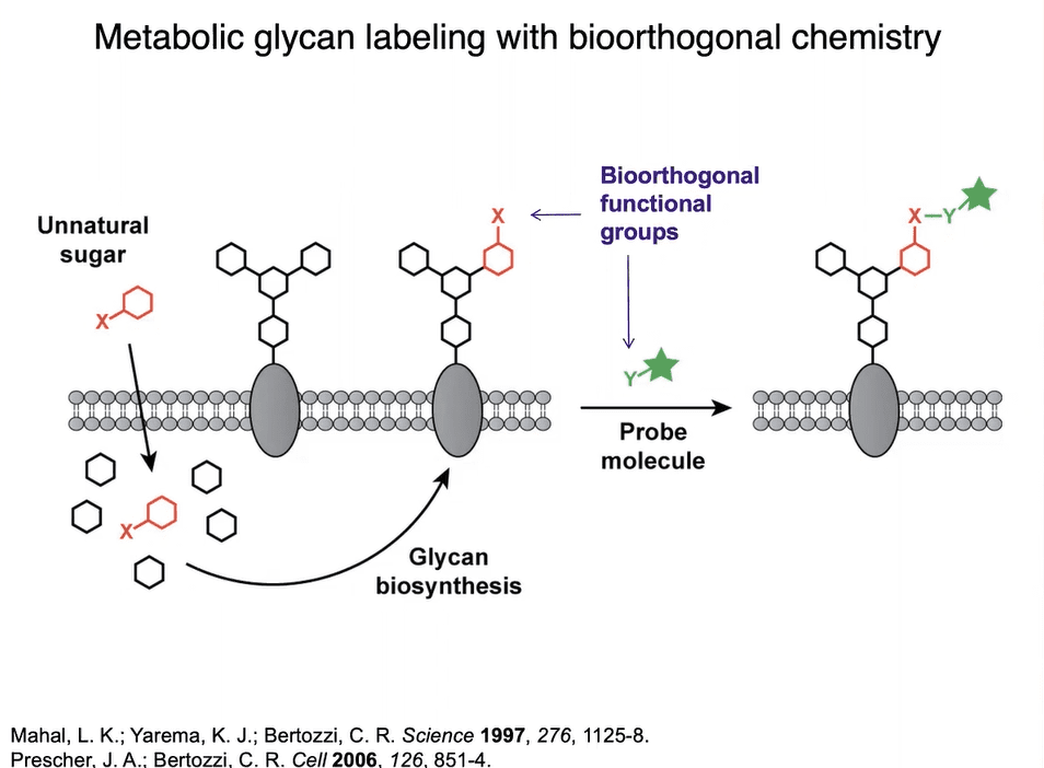 The original idea was to introduce a marked sugar building block – X - into the cell, which would then be displayed on the cell surface. A separate detectable labeling agent – referred to as Y – would be primed to recognize the marked residue that was then added.