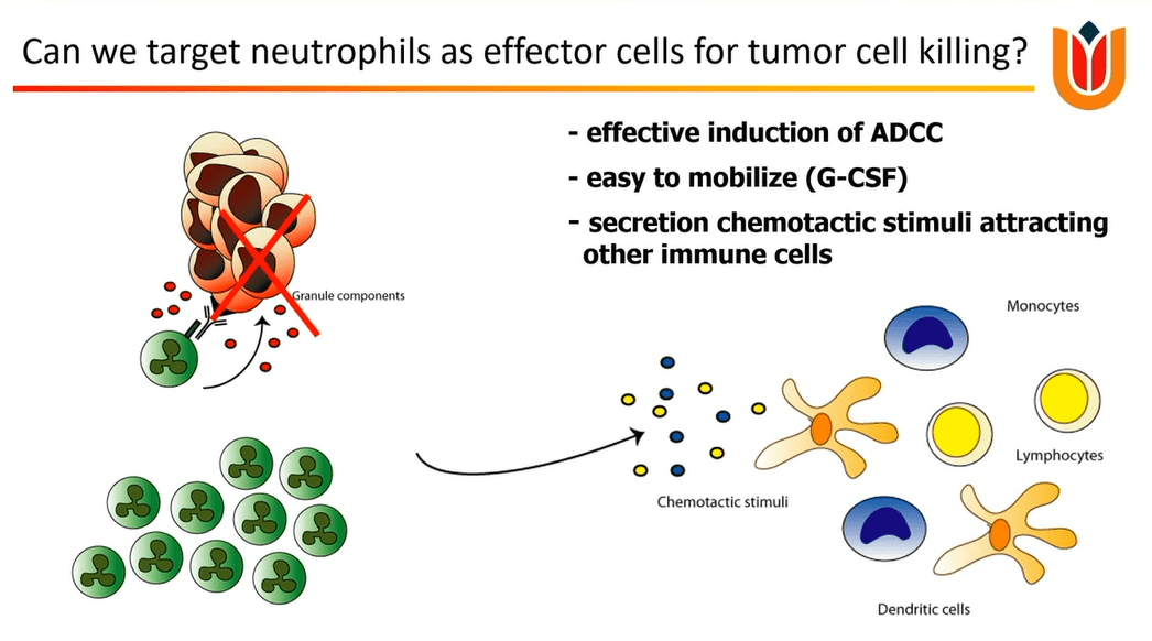 “However, with an antibody they could induce ADCC [Antibody-dependent cellular cytotoxicity]. A great advantage of neutrophils is their sheer number. So 60 to 70 percent of our circulating cells white blood cells are neutrophils and this is the tip of the iceberg because there is a whole depot in the bone marrow.”