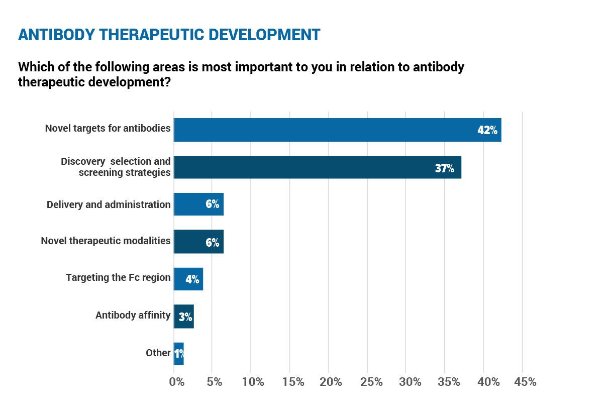 42% of respondents say that novel targets for antibodies is the most important area of development to them. This portion includes most of those who work in auto-immune diseases (58%), neurodegenerative conditions (47%) and infectious diseases (42%).
