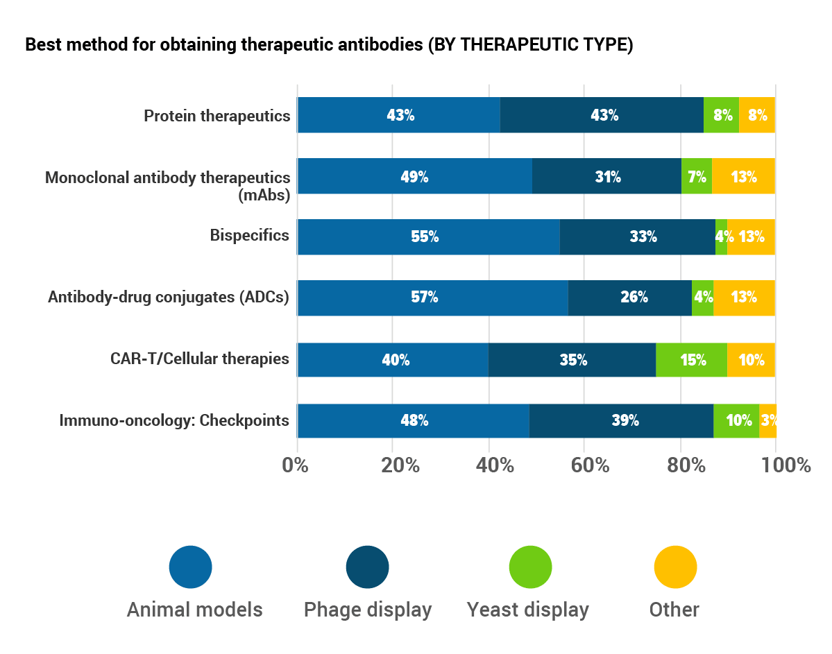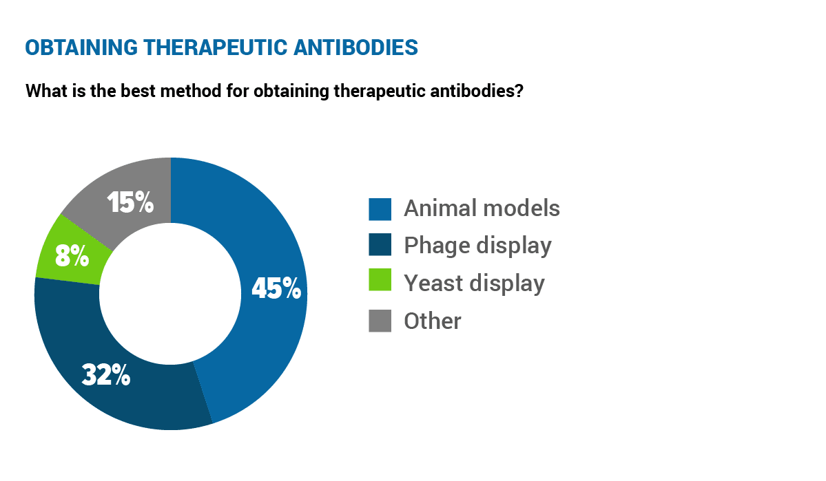 Animal models are selected by the most respondents as the best method for obtaining therapeutic antibodies.