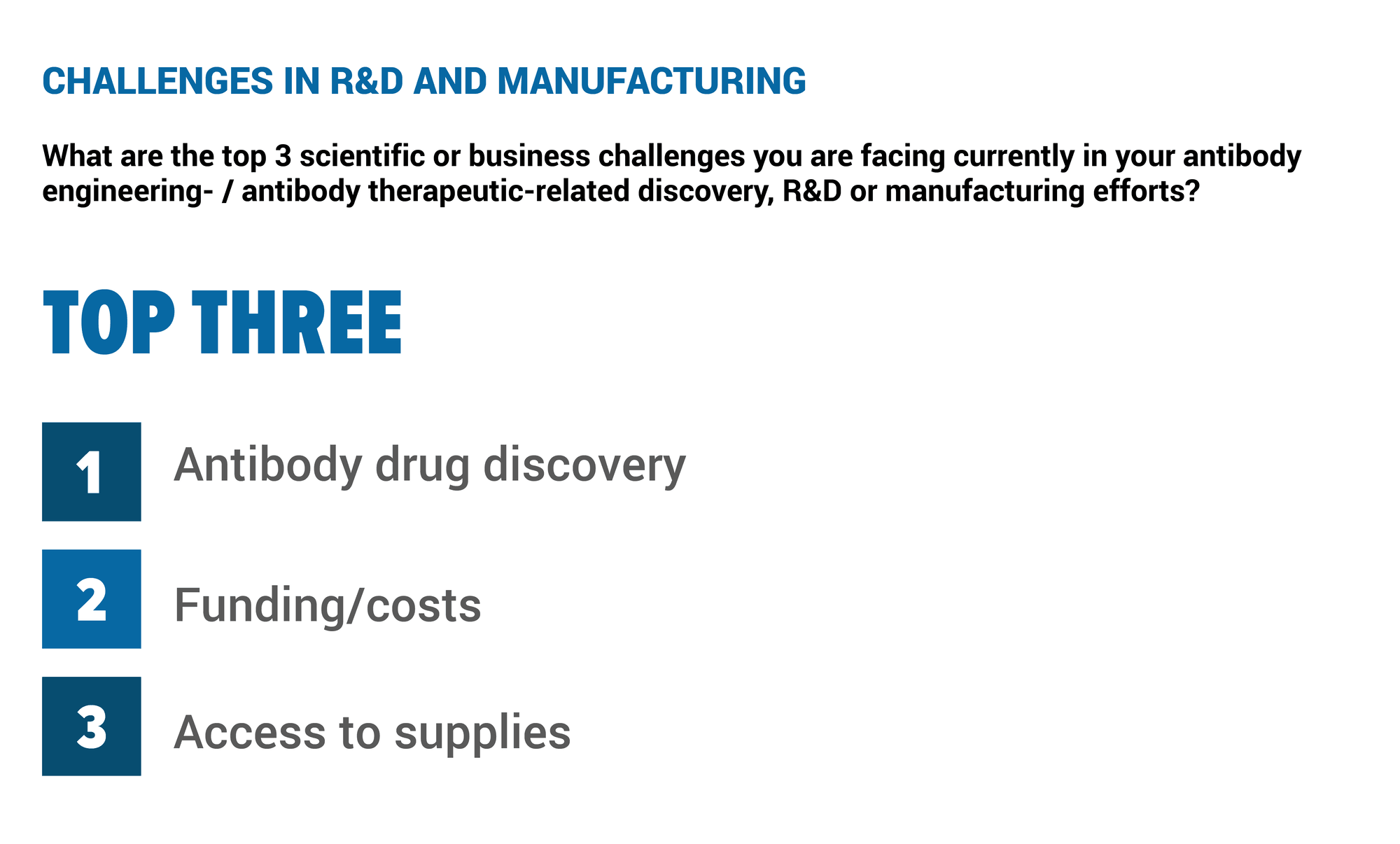Most respondents say antibody drug discovery processes such as screening, characterization and target identification were the biggest challenges in their R&D and manufacturing.