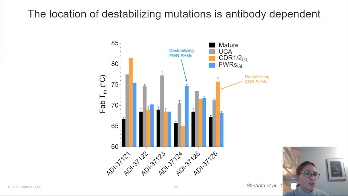 Dr Walker closed the talk with an interesting observation that naïve B cell-derived mAbs show higher thermostability compared to memory B cell-derived mAbs. Somatic mutations led to decreased thermostability and the location of destabilizing mutations was found to be antibody-dependent. In general, Kappa LCs and VH4 germline antibodies were found to be more thermostable than other antibodies. Dr Walker concluded that human B cell-derived antibodies show favourable polyreactivity, hydrophobicity and thermal stability properties. Her work laid important ground on principles to control polyreactivity, hydrophobicity and thermal stability of antibodies.