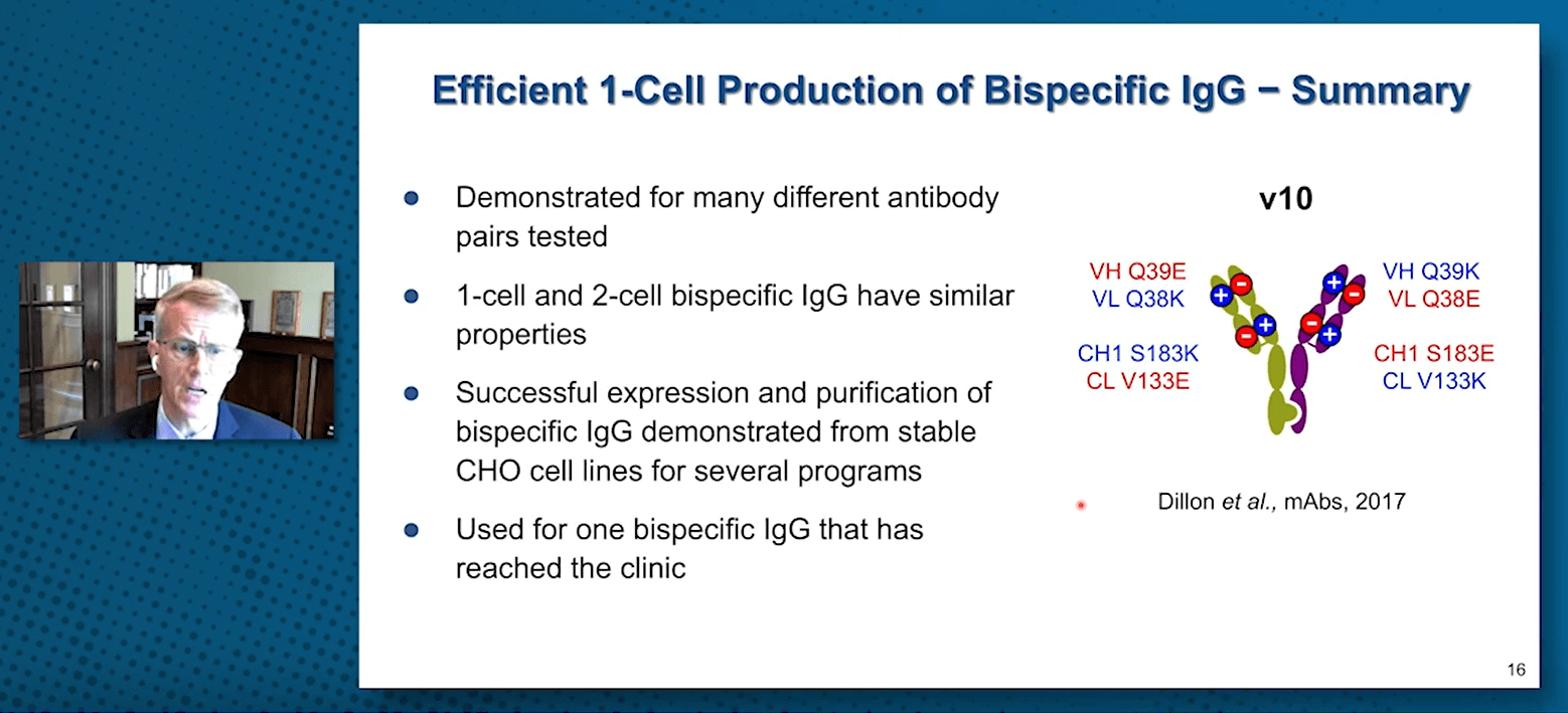 Using current methods, light and heavy chains are expressed separately in two separate cells and then assembled in vitro into bispecific IgGs. Genentech improved and simplified the manufacturing process: bispecific IgGs were re-designed for 1-cell production. Dr Carter presented work on v11 IgG as an example of this design (Dillon et al., 2017). He showed that 1-cell and 2-cell bispecifics have similar in vitro potency and pharmacokinetics. Most significantly, 1-cell production of bispecific IgGs at large scale is successful. One such bispecific IgG has reached the clinic.