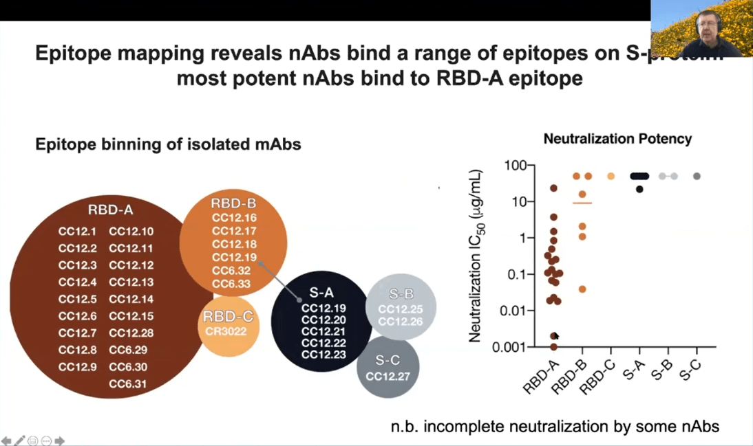 Prof Burton’s group took the potent antibodies forward to describe the binding mechanism to SARS-CoV-2. Binding to 3 major epitopes on RBD (RBD-A, RBD-B, RBD-C) and 3 epitopes that are non-RBD (D proteins) was described. Prof Burton explained that the antibodies against RBD proteins proved to be most potent, although some antibodies showed incomplete neutralization. He focused the rest of his talk on the antibodies binding to RBD proteins.