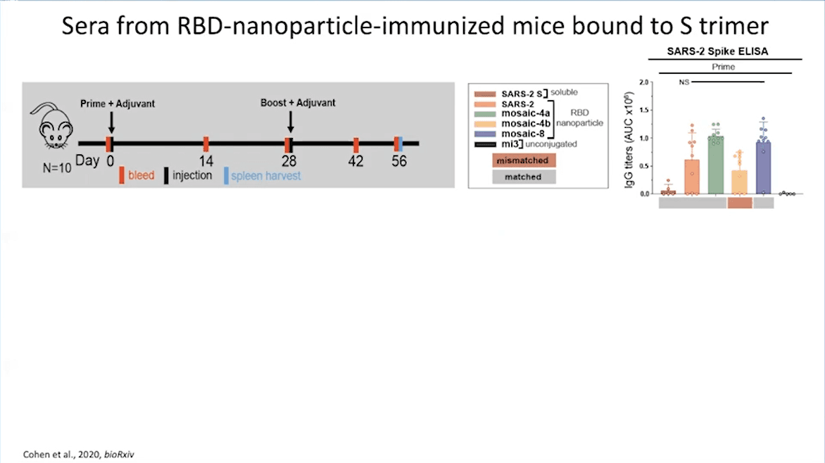 In the second part of her talk, Prof Bjorkman pointed out that even after developing a COVID-19 vaccine, we are at risk of zootic transmission from coronaviruses from other hosts. She presented her work on a pan-coronavirus vaccine. Using a previously published system, immunogens can be attached to nanoparticles (Brune et al., 2016; Escolano/Gristic et al., 2019). Prof Bjorkman combined the SpyTag particle system with COVID-19 antigens to make four types of RBD-nanoparticles: homotypic SARS-2 and three mosaics (combining SARS-2 particles with other particles). For this, they used RBDs from 8 sarbecovirus spike proteins for making nanoparticles, including RBDs from viruses with spillover potential. They immunized and boosted mice with RBD-nanoparticles of different types. SARS-2 spike ELISA assay results showed that antibodies raised against RBD monomers can bind to RBDs on S trimer.