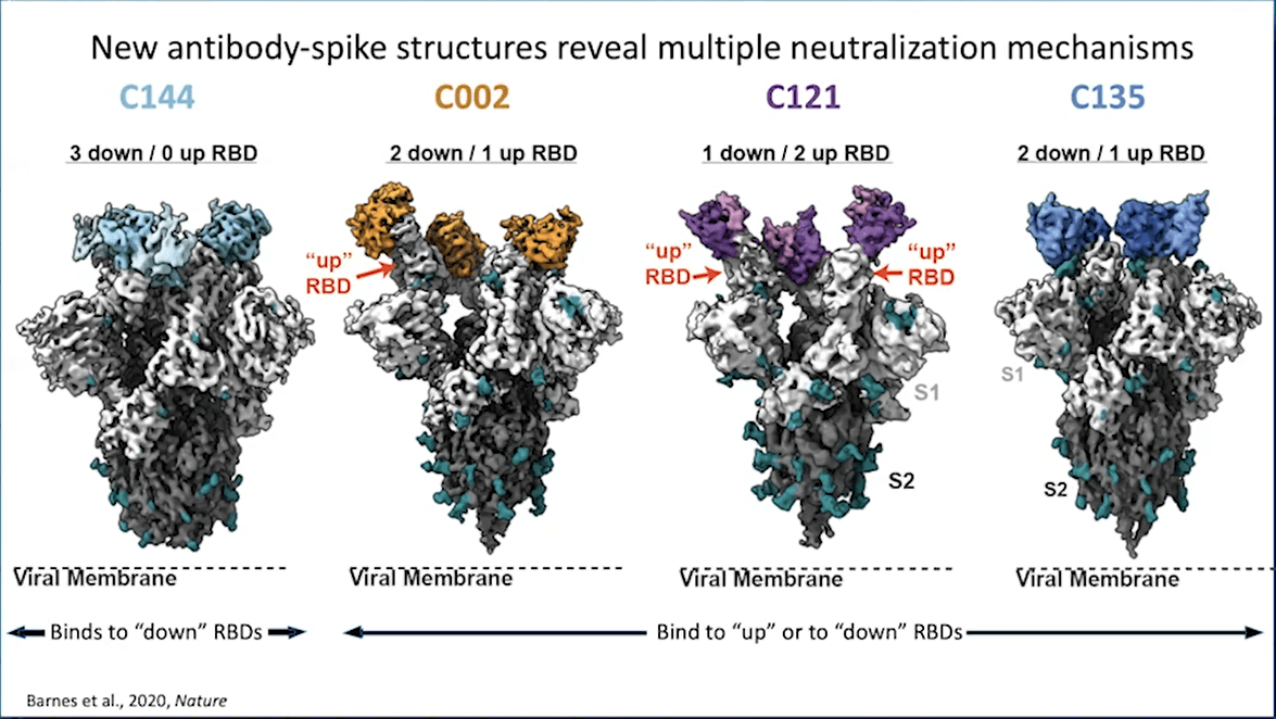 Prof Bjorkman presented her research using single-particle cryo-EM to highlight the structural correlates of neutralization for potent monoclonal antibodies. COVID-19 spike protein structure includes receptor binding domains (RBDs) that can be in two positions. To bind to ACE2, it needs to be in an “up” position. Neutralizing antibodies block the ACE2 binding site and only bind to “up” RBDs. All neutralizing antibodies identified by Prof Bjorkman were found to bind to C105 epitope, supported by previous work from other laboratories. Prof Bjorkman’s group summarized the neutralization mechanisms based on antibody-spike structures in a paper authored by Barnes et al. (2020).