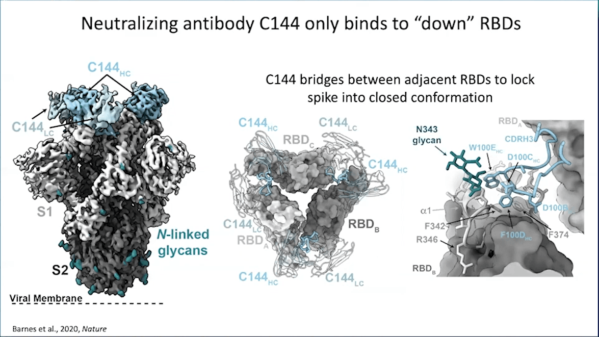 Prof Bjorkman explained in detail the neutralization mechanism of one antibody named C144, that only binds to “down” RBDs. She revealed that C144 bridges between adjacent RBDs, locking the spike into closed conformation, highlighting the conformational changes in play.
