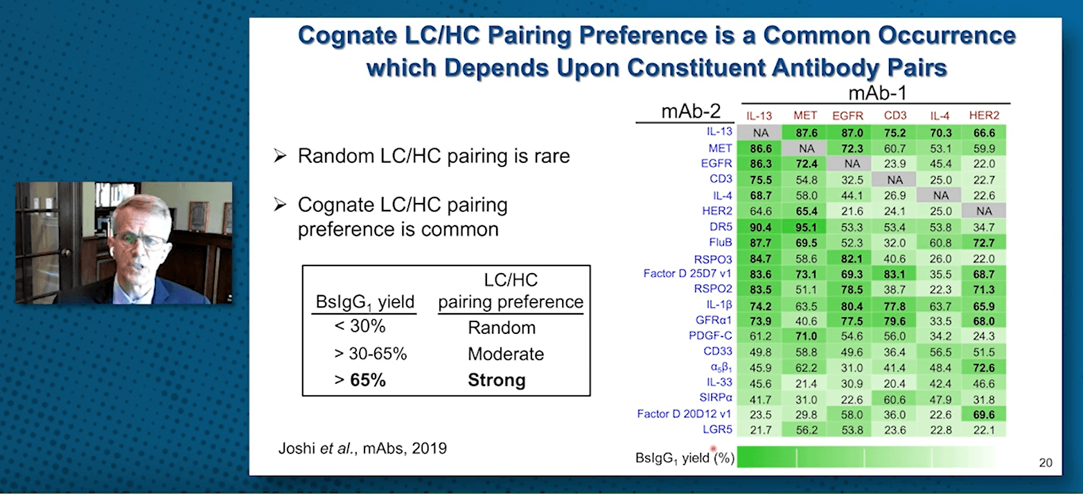 Building upon his work on 1-cell bispecific IgGs, Dr Carter presented results of cognate light chain/heavy chain (LC/HC) pairing preference. To evaluate the LC/HC preference, his group quantified bispecific IgG yield with orbitrap LC-M after transient expression of IgG pairs in a single cell (Joshi et al., 2019). It was found that cognate LC/HC pairing preference is a common occurrence and can be strongly influenced by residues in CDR L3 and CDR H3. Such knowledge may be advantageous to reduce risks occasionally encountered with engineered proteins and the number of Fab mutations needed for efficient production of bispecific IgG where there is strong intrinsic pairing preference.