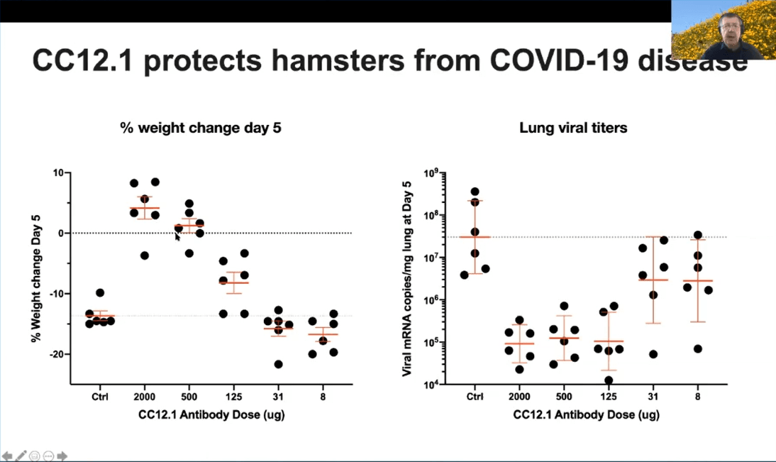 Prof Burton’s groups further examined the potential of the potent antibodies from in vitro experiments to validate these in vivo using a Syrian hamster model. The antibodies selected were against RBD-A epitope and non-RBD epitopes. The potent neutralizing antibody CC12.1 against RBD epitope protects hamsters from COVID-19 disease, both weight loss and viral titers in the lungs. As expected, the CC12.23 antibody against S protein does not protect hamsters from COVID-19.