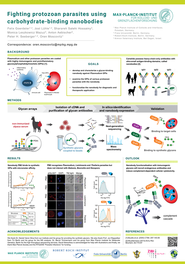 Next, we sought to functionalize the nanobody for therapeutic applications. Foreign and immunogenic glycan epitopes such as rhamnose or aGal, are present on the food that we consume. They initiate the development of glycan-specific naturally-circulating antibodies. We aim to exploit the presence of such antibodies to amplify an anti-parasitic response using synthetic glycan-coupled nanobodies. The functionalized nanobodies will recruit naturally-circulating antibodies and subsequent anti-parasitic complement response.