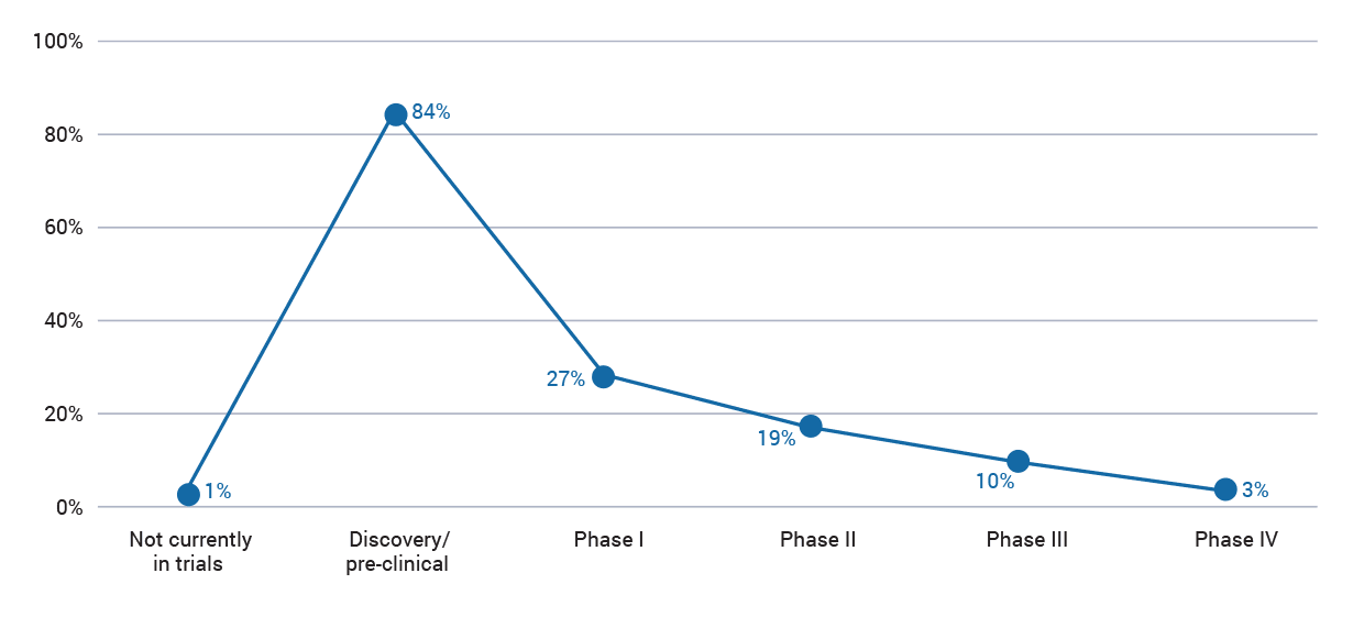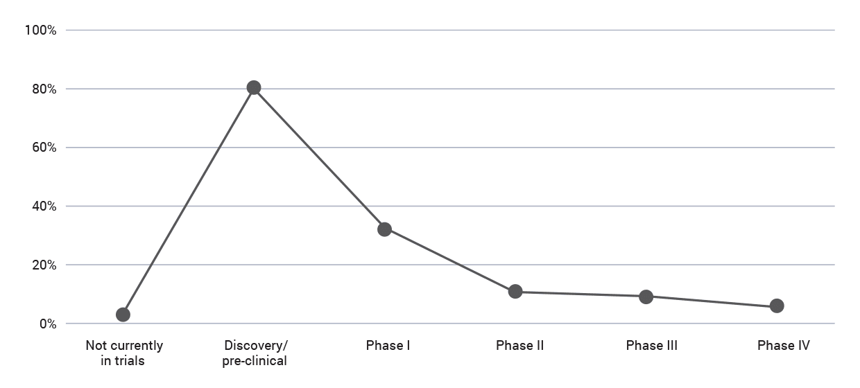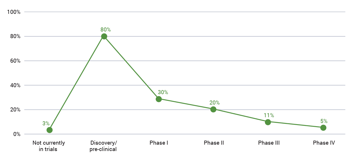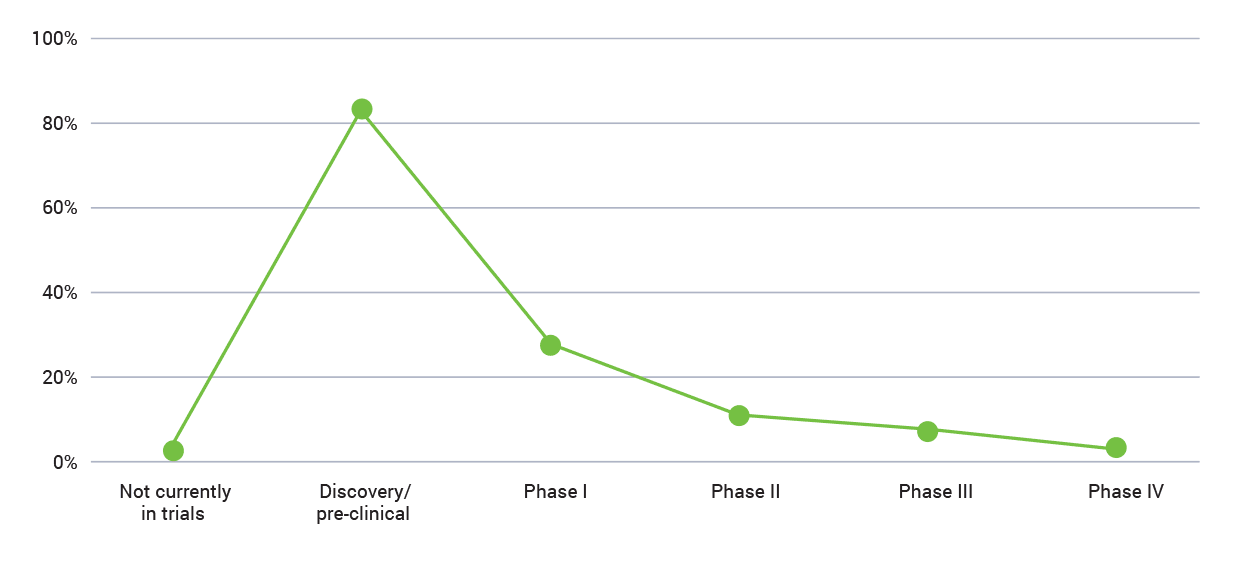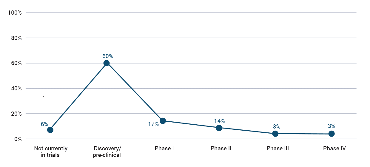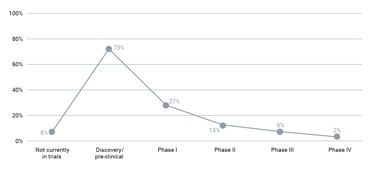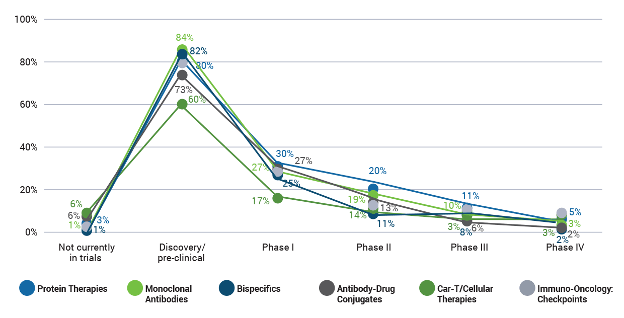 Looking more closely at the stage of development of different modalities, it is a similar story for most. However, protein therapeutics appear to be slightly more advanced amongst respondents, with 36% in Phase II-IV trials, versus just 21% of those working with bispecifics.