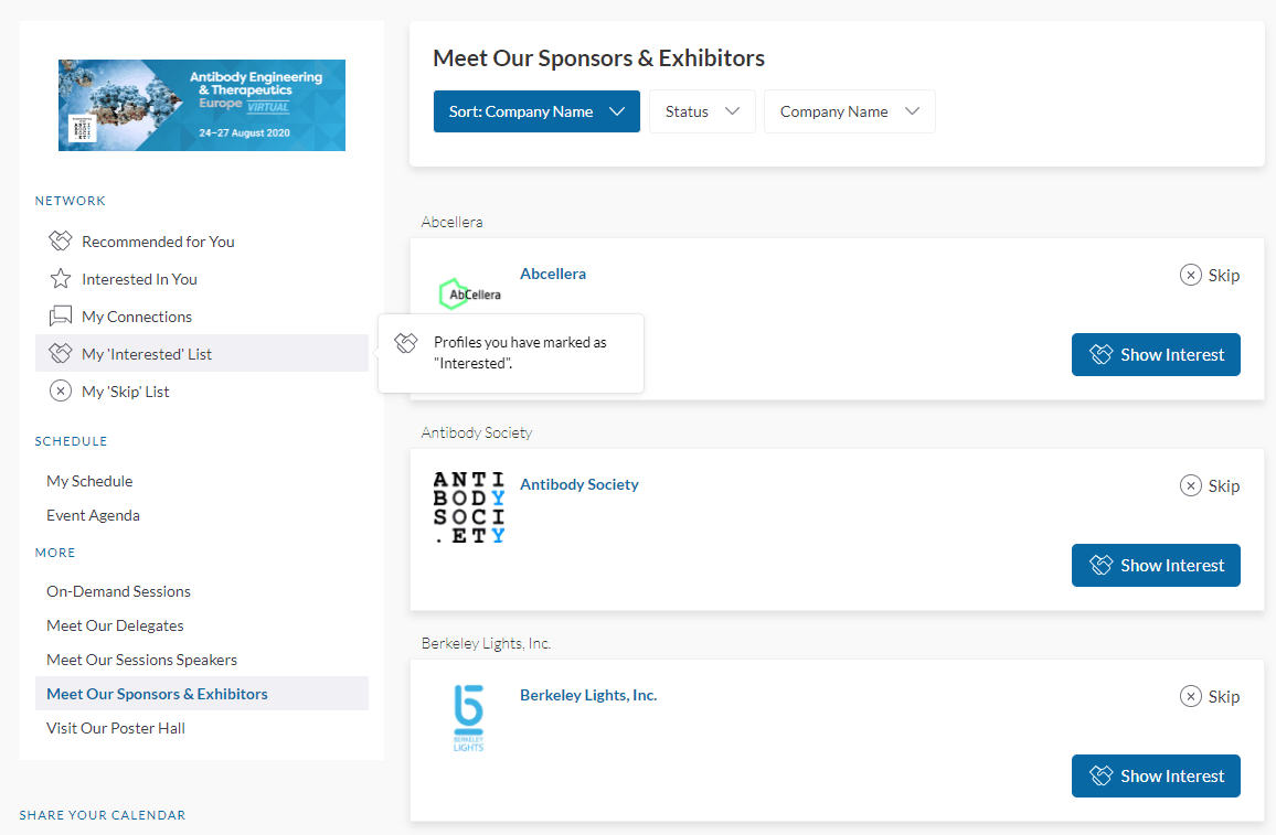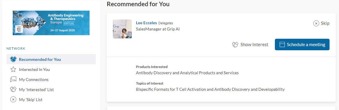 From here you can schedule 1-1 meetings, show interest and if applicable 'skip' a specific attendee. These are also categorised on the left- hand side under the "Network" section.