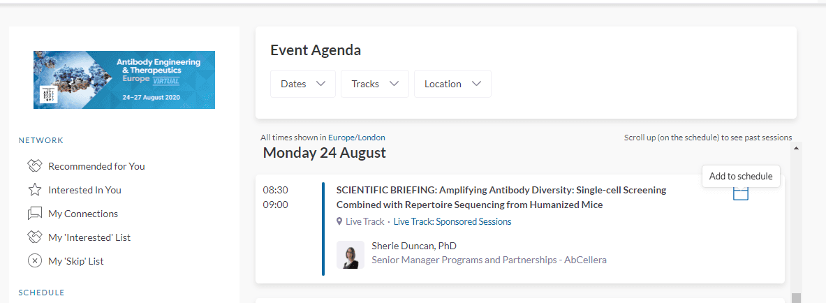 • Login into the virtual conference platform and update your profile • During the live dates, view the attendees list and request meetings with people you would like to connect with • Participate in live panel discussions and “hot topic” discussions • Stay engaged by using the chat function during sessions to participate in Q&A • Mark the dedicated poster viewing times in your calendar and visit the posters • Visit the exhibitors and watch the scientific briefings to gain valuable information about antibody technologies and products