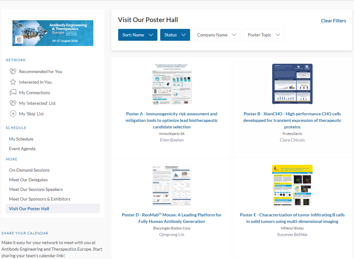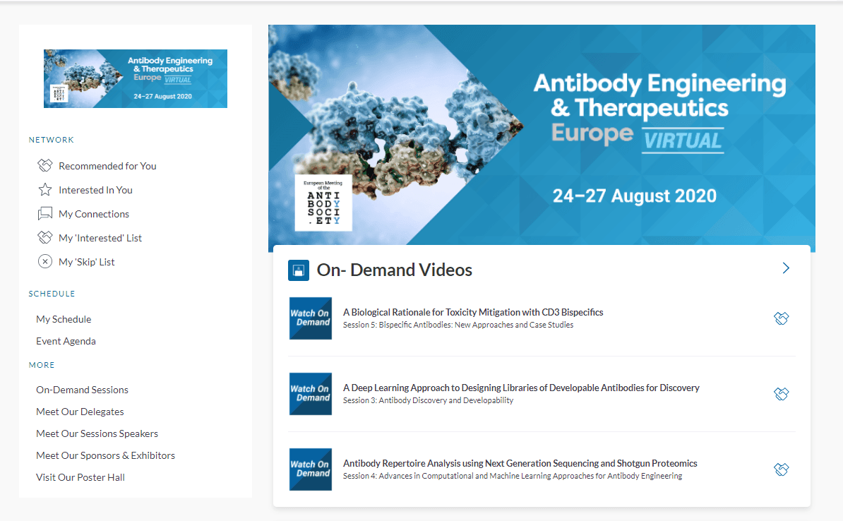 Our team, in conjunction with The Antibody Society, has developed this event to allow you to interact virtually with attendees, speakers, poster presenters and sponsors/exhibitors. These are some of the exciting elements you can take advantage of: