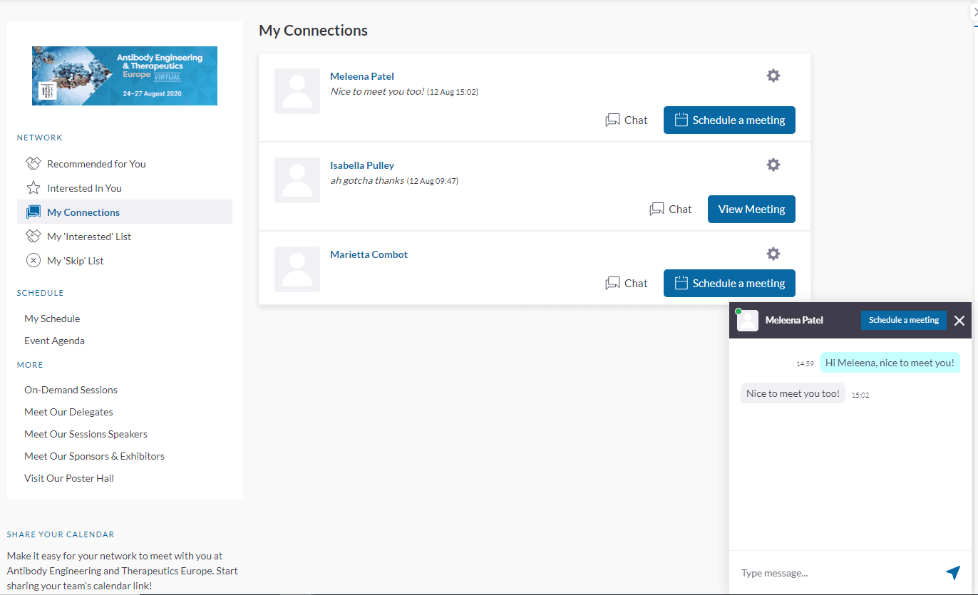 As well as schedule meetings, you also have an instant chat function which appears as a pop-up at the bottom of your screen for anybody that you have made a connection with.