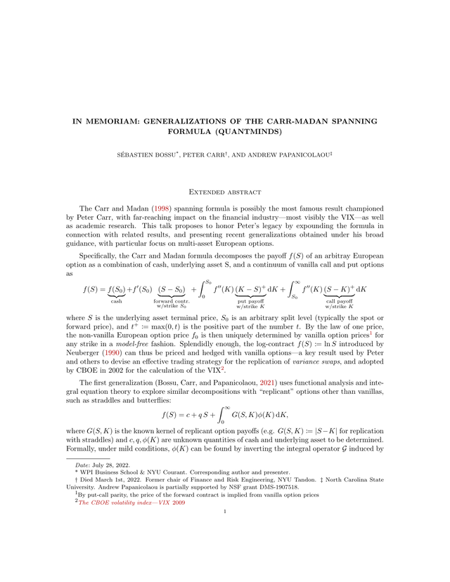 The Carr and Madan (1998) spanning formula is possibly the most famous result championed by Peter Carr, with far-reaching impact on the financial industry—most visibly the VIX—as well as academic research. This talk proposes to honor Peter’s legacy by expounding the formula in connection with related results, and presenting recent generalizations obtained under his broad guidance, with particular focus on multi-asset European options.