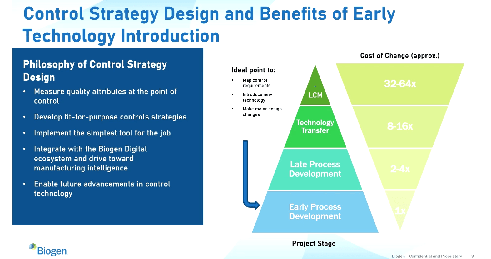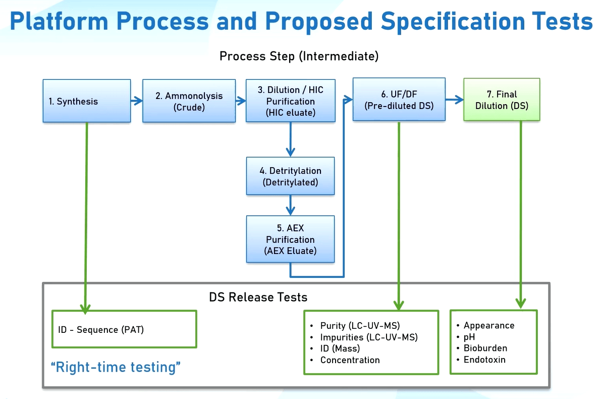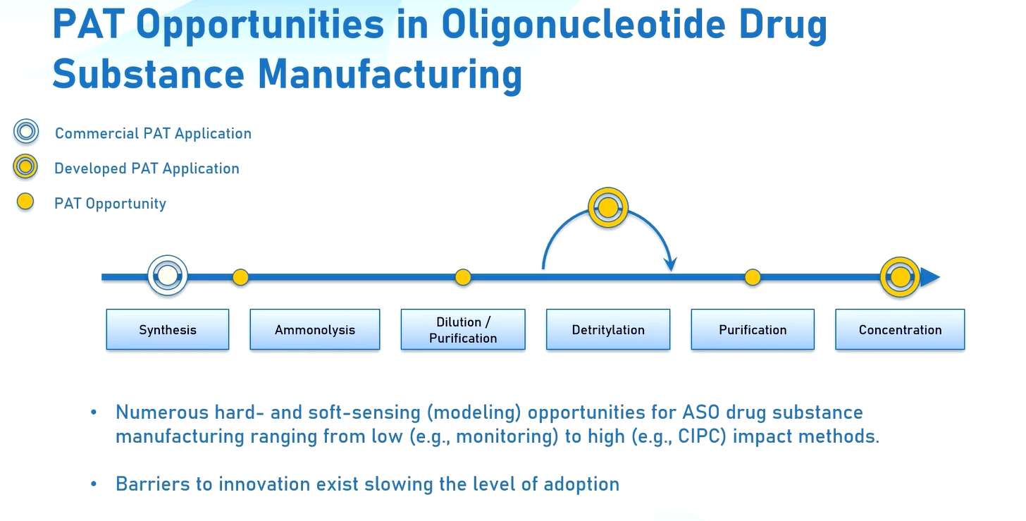 There are several opportunities at ASO manufacturing procedures to implement PAT applications. Early process development is good time to apply control strategies, monitor the control requirements, introduce new technology, and make major design changes with comparably low costs. Hill explained that the PAT system used at Biogen is specifically focused on the sequence ID.