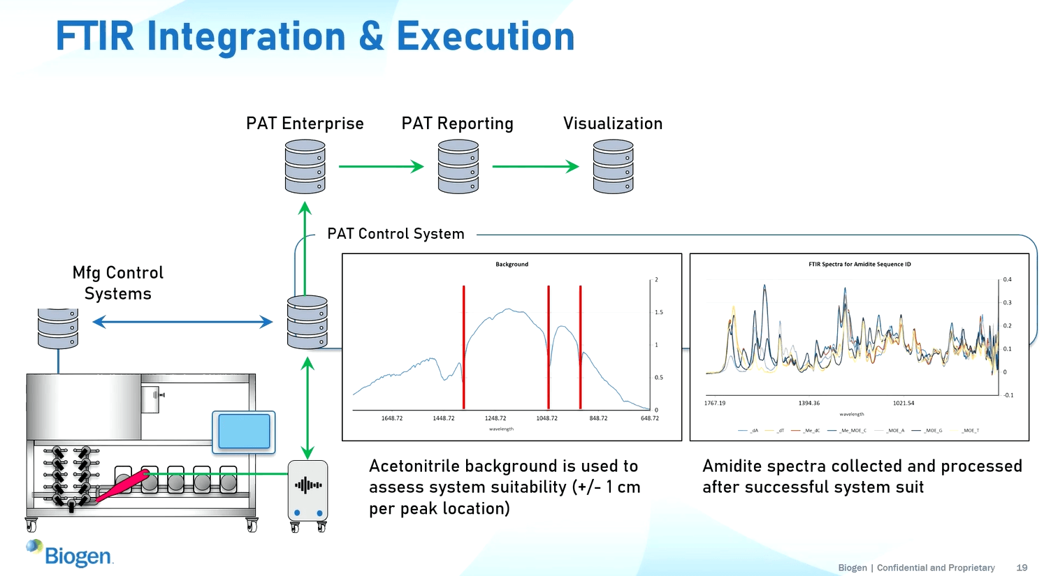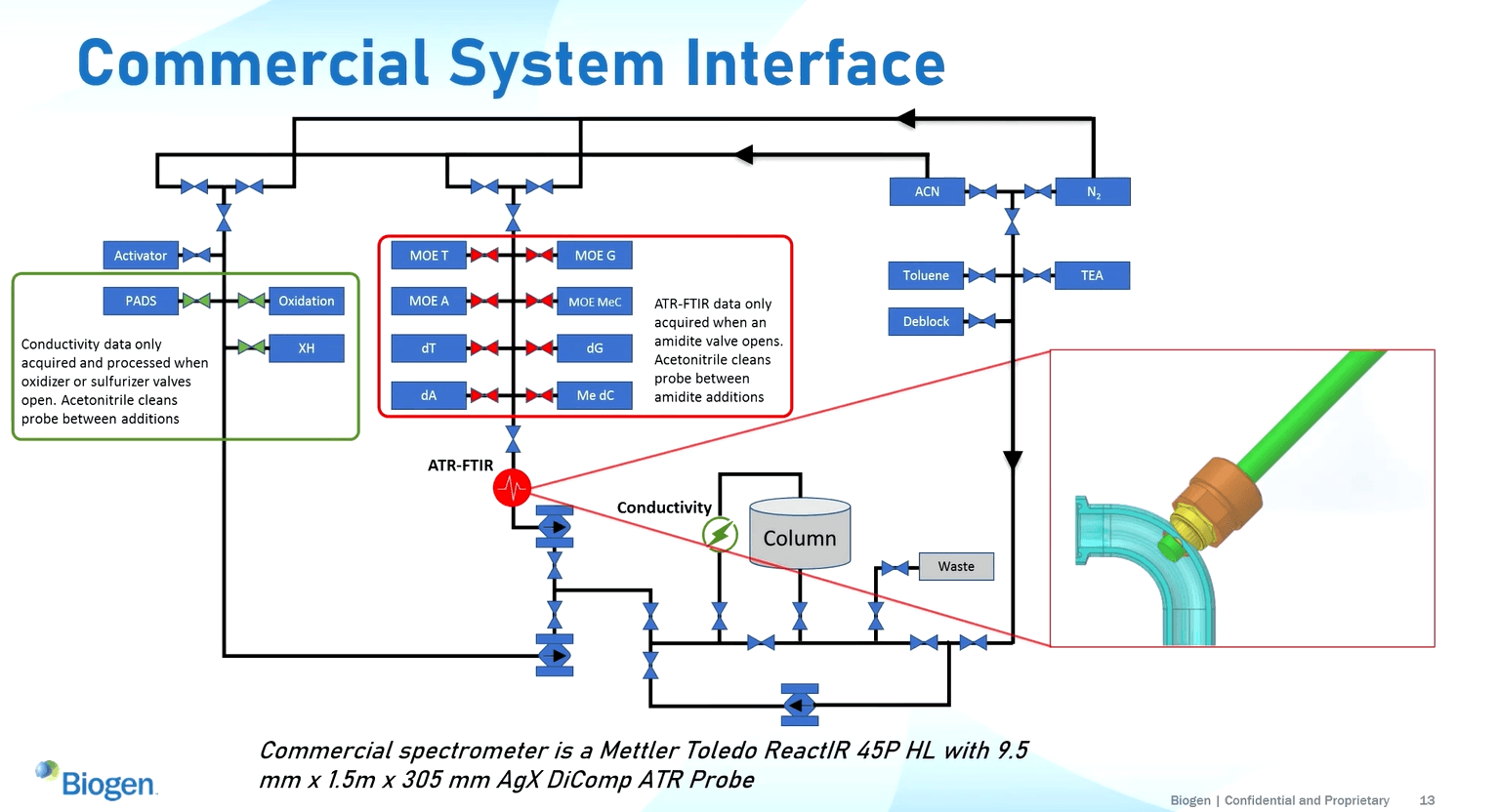 The Biogen synthesis device has ports specific to each amidite. One essential function of their inline PAT system is to track the synthesis and ports to monitor incoming amidites and any modifications. Hill explained that amidites are responsive to infra-red (IR) and share data indicating that each DNA base (dA, dC, dG, dT) and sugar-ring modification have different IR profiles like a fingerprint in certain spectral regions.