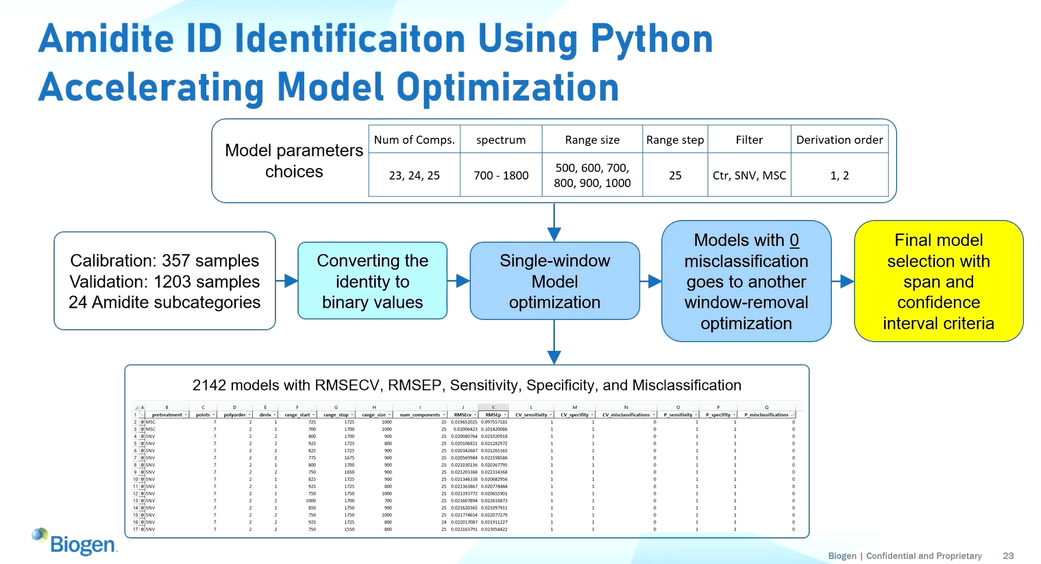 They built a calibration set at Biogen that reflects the variability types seen in manufacturing such as concentration of amidite solutions, flow rate of the solutions through the flow path and instrument-to-instrument variations. When they manipulated each variable, the data they obtain indicated not only the robustness of the method, but was also helpful in overall technical transfer from the laboratory to manufacturing. Hill described the use of the partial least squares discriminant (PLSD) analysis model which is a multivariate model discriminating components and is helpful in setting thresholds and performing classifications based on scores. The model they used has been validated by numerous tests for the specificity of the raw spectra, model, and results. One strategy to assess the model beyond its ongoing diagnostic assessment in a comparably stable process with stable materials is to introduce new amidites. To do so, they have looked at cEt materials and obtained effective responses in the IR to distinguish different families of amidites. Instead of all-in-one model approach, they also proposed a hierarchical modeling approach which classifies based on the family of the amidites such as deoxy, MOE, cEt and so on and then identifies each base within a class. Lastly, Mr. Hill mentioned the use of Python to accelerate the model optimization which also increases the throughput of analyses.