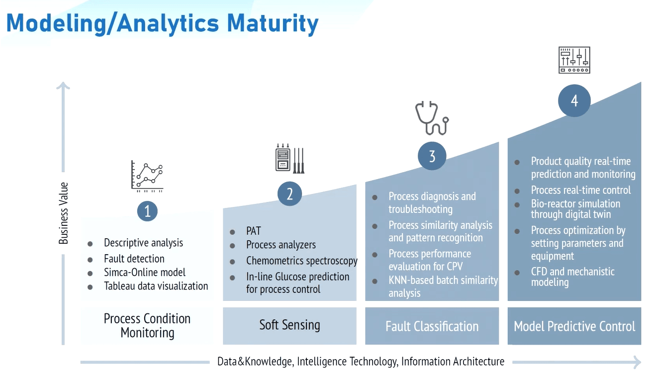 While discussing the gains of data flow, Hill explained a modeling and analytics maturity model with a biology-focused approach. As we understand the data and build process monitoring capabilities, we can go further by developing predictive capabilities. Some PAT principles can be applied to a soft sensing stage. These are followed by having an understanding of the underlying causes of certain faults or outputs leading to fault classification. When one can understand the way the process is responding and the inputs to those responses, it is possible to become more adaptive and begin using model-based predictive controls.