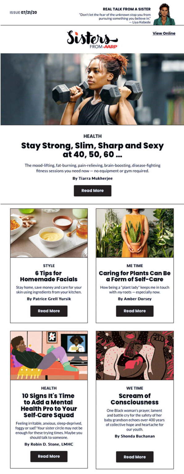 Sisters From AARP, which targets Black women over 40, is one shining example of this strategy. The weekly newsletter and website won the 2021 Content Marketing Award for Best Digital Publication.