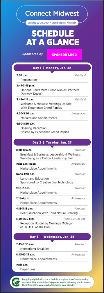Sponsoring the schedule at a glance at Connect Marketplace is an excellent way to increase brand visibility and recognition. Your company logo and messaging will be displayed at the top of the digital schedule at a glance for all attendees to see.SPONSORSHIP INCLUDES:- Sponsor artwork behind digital schedule at a glance card.- Schedule at a glance will be linked to a QR code that will be shown on signage and through the app.- Exclusive. PRICING: Schedule at a Glance $15k*Example of a digital Schedule at a Glance from Connect Midwest 2024.