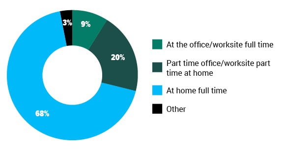 The majority of respondents - 68% - were working at home full time at the time of the survey (14-22 April 2020). This figure is highest for North American respondents at 74%, versus just 59% of those based in Africa.
