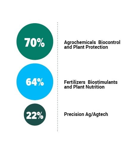 In terms of product types, 64% of respondents said fertilizers/ biostimulants/plant nutrition best described their product type, while 70% said it was agrochemicals/ biocontrol/plant protection (in multi-choice question). Precision ag/ag tech was selected by 22%.