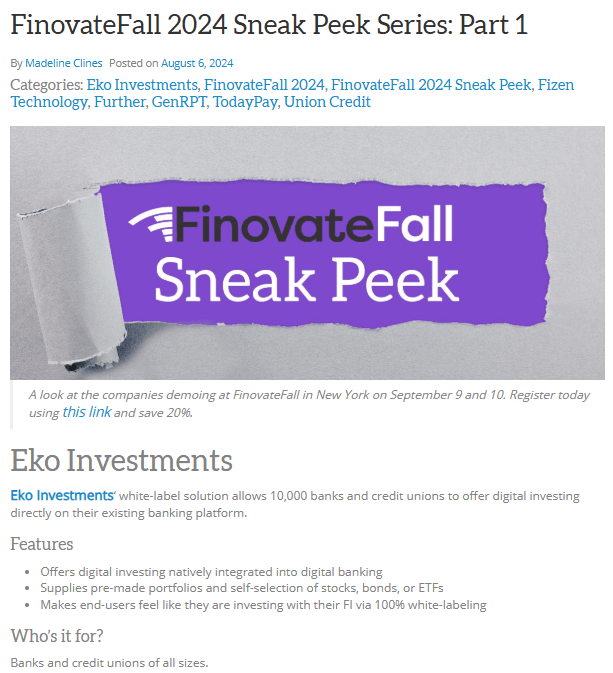 As part of the marketing campaign for the event, we publish “sneak peek” blog posts several weeks before the event. The goal of the campaign is to provide a teasing snippet of information about your company and innovation to current and potential attendees to pique their interest.