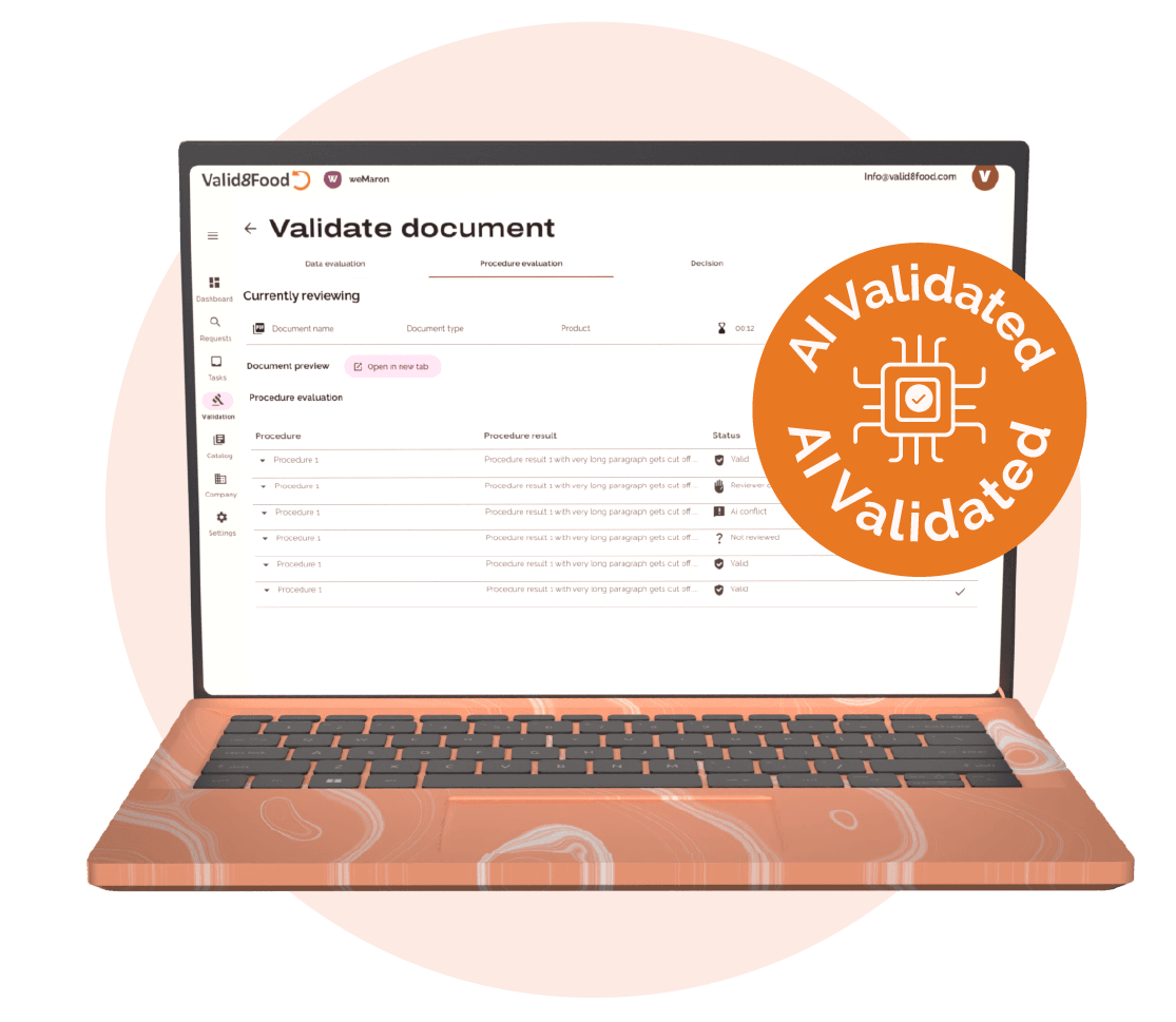 “We provide automated validation of food ingredient documentation through an AI-powered system. The process involves uploading files to valid8express.com, which generates comprehensive validation reports in minutes.