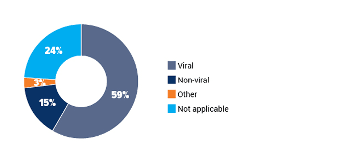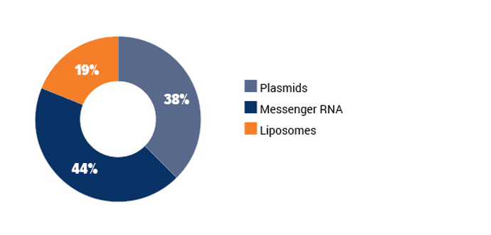 Out of those using non-viral methods, the majority said they were working with messenger RNA and plasmids, while 19% said they were using liposomes instead. mRNA ranked the most popular delivery vehicle used by 44% of the respondents, with plasmids closely behind at 38%.