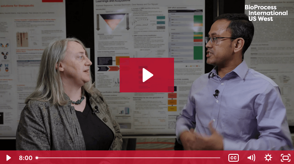 BioProcess International's Editor in Chief, Cheryl Scott, interviews 1st place poster hall winner, Eashwar Rajaraman, principal scientist at Biologics Research Center of Novartis. His team's poster “Iterative design of a DSP Work Package for Multispecifics: Learnings and Adaptations,” summarizes lessons learned in developing a platform-like approach to downstream processing of multispecific molecules. The team identified and resolved issues related to high–molecular-weight species arising during viral inactivation, developing polishing steps to meet desired quality thresholds for final drug substance, and preparing that substance for highly concentrated formulation. A protein-purification specialist, Rajaraman has been with Novartis for over a decade. He holds a master of science in biochemical engineering from the University of Georgia and a master of science in biology from the Birla Institute in India.
