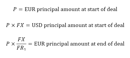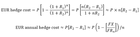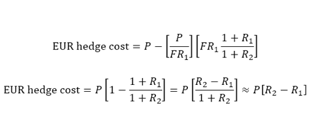 The mechanics of the package are thus: the EUR based investor exchanges EUR for USD, buys the USD bond, and puts on a maturity-matched FX hedge. Simplistically, assuming a 1-year period, and without worrying about coupon payments, we can write this as below.