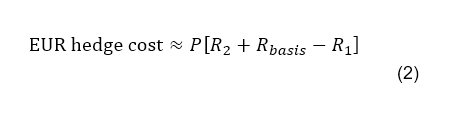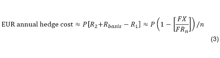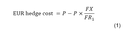 So we may now calculate a hedged yield pick-up which is actually accessible to the EUR based investor. It is FX hedged and relatively risk free. Note that equation (3), where the hedge cost is expressed in terms of the FX spot and forward rates, is a novel way of calculating hedge cost. It is useful in that it is an alternative way of arriving at the answer from other data series than those usually used.