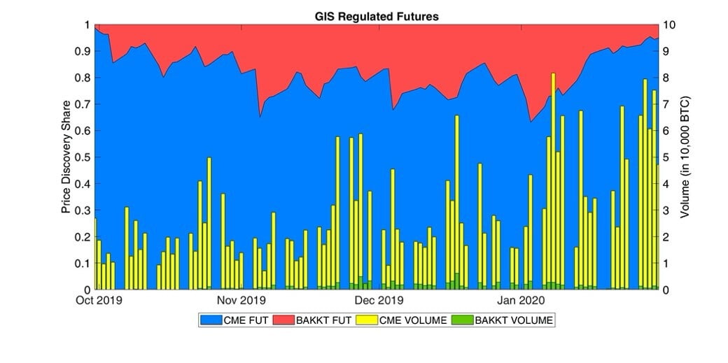 Bakkt, a subsidiary of ICE, eventually launched their (physically-settled) bitcoin futures in September 2019, after considerable media coverage. However, after an initial surge of interest, they have (as yet) failed to capture market share from the CME. In January 2020 the ADV on Bakkt futures was only $12 million, compared with $450 million on CME futures. So, it is not surprising that about 95% of new information – on institutional bitcoin platforms – is led by traders on the CME.