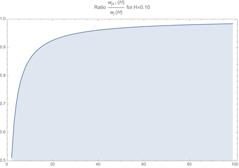 And the more interesting conclusion is that, in order to decay that slowly, the weights after a relatively low number of lags cannot be too different. In fact, the ratio of successive coefficients approaches 1 quite quickly: