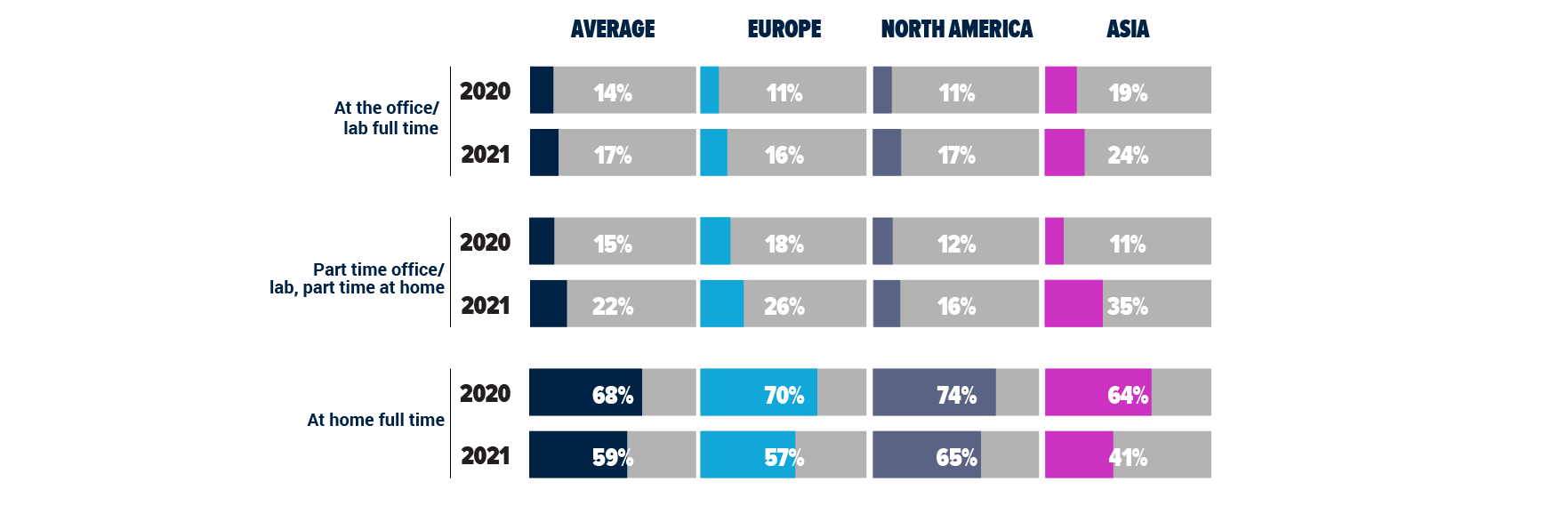 Lockdowns forced a huge proportion of the workforce worldwide to stop coming into the office and start working from home more. Our 2020 study showed that 68% of respondents were working from home full time, and just 14% were at the office/lab full time.