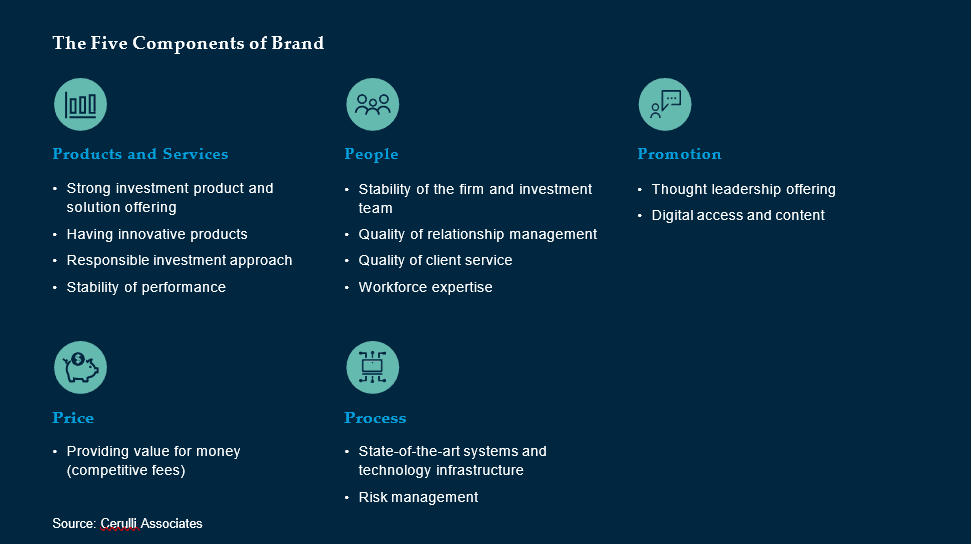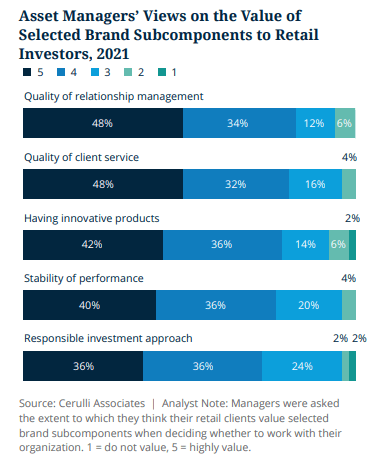 What fund selectors want most varies by market and channel. For example, the three brand subcomponents that fund selectors operating in the UK value most in asset manager brands are strong investment products, competitive fees, and stability of performance.