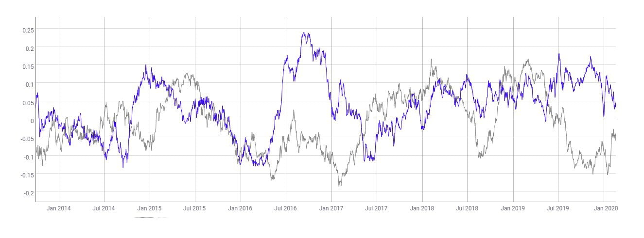 Figure 5: Spearman Correlation Coefficient for Bitcoin vs S&P500 (Gray) and Bitcoin vs Gold (Blue) for the period 3 October 2013 to 18 February 2020