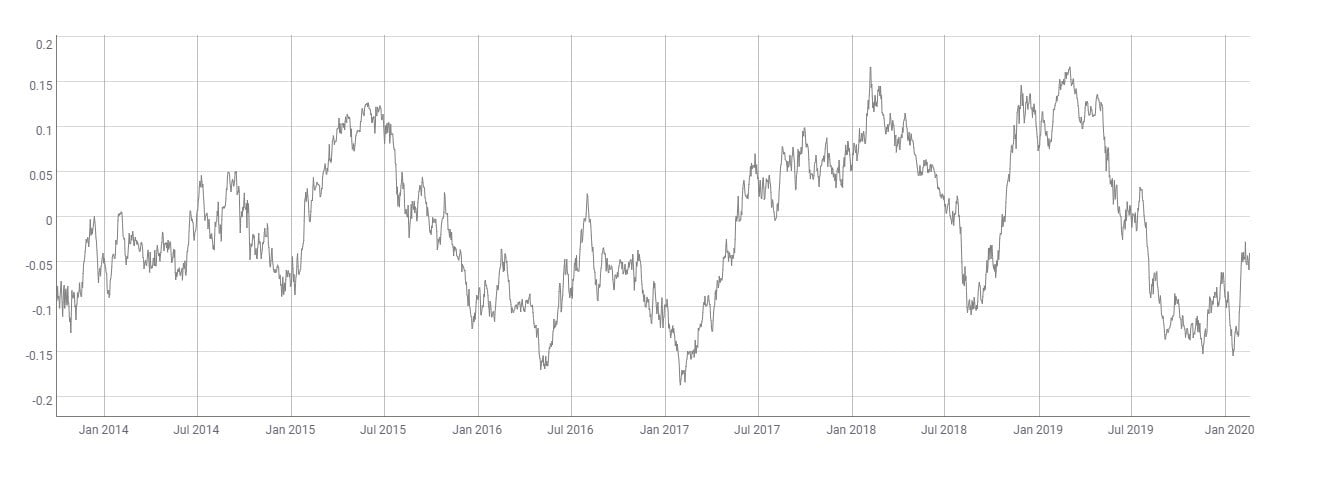 Figure 4: Spearman Correlation Coefficient for Bitcoin vs S&P500 for the period 3 October 2013 to 18 February 2020