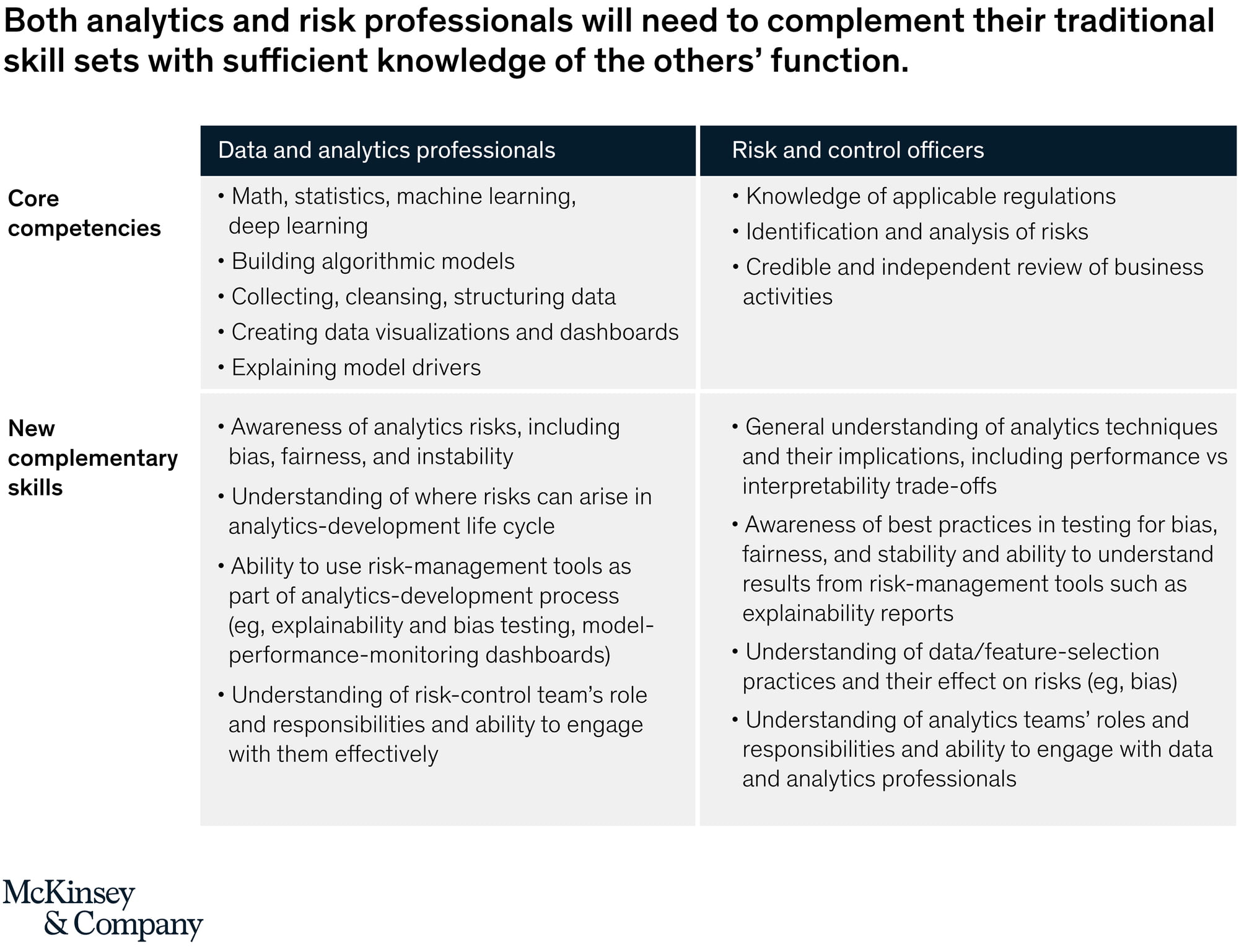 In practice, analytics teams need to manage model risk and understand the impact of these models on business results, even as the teams adapt to an influx of talent from less traditional modelling backgrounds, who may not have a grounding in existing model-management techniques. Meanwhile, risk managers need to build expertise—through either training or hiring—in data concepts, methodologies, and AI and machine-learning risks, to ensure they can coordinate and interact with analytics teams.