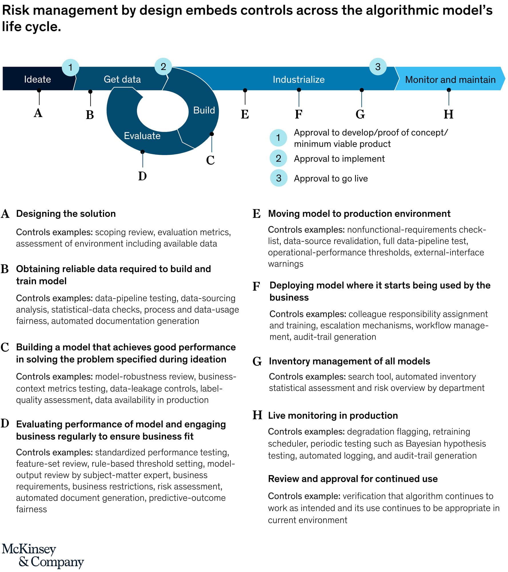 In this complex and fast-moving environment, traditional approaches to risk management may not be the answer. Risk management cannot be an afterthought or addressed only by model-validation functions such as those that currently exist in financial services. Companies need to build risk management directly into their AI initiatives, so that oversight is constant and concurrent with internal development and external provisioning of AI across the enterprise. We call this approach “derisking AI by design”.
