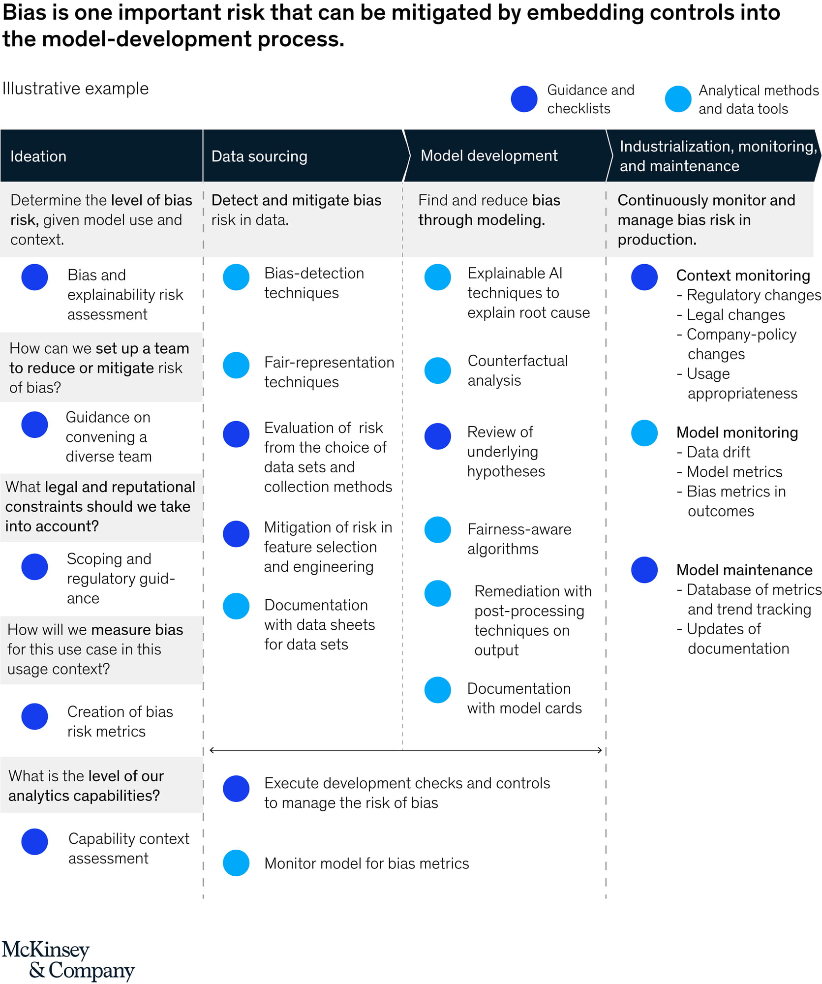 As an example, one of the most relevant risks of AI and machine learning is bias in data and analytics methodologies that might lead to unfair decisions for consumers or employees. To mitigate this category of risk, leading firms are embedding several types of controls into their analytics-development processes.