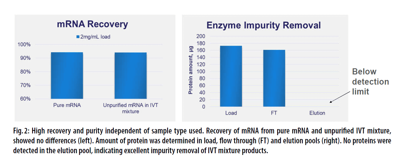 Standard mRNA contains between 1000-5000 nucleotides, which is the size the resin was designed to optimally operate in. Optimized conditions can maximize the binding capacity, even for larger RNAs, to achieve a more efficient purification process. “From a binding perspective, we have seen customers achieving up to 5mg/ml of 4000 bp mRNA,” says Flook. “This is significantly higher than what you would see with some of the research products.” A standardized experiment looked at the binding capacity of three different sizes of mRNA without optimizing conditions for each independently. Size did not impact recovery even with samples straight from an IVT mixture. Low nonspecific binding and the affinity approach only allow polyA species to bind. Recovery rates are greater than 90% and, in most cases, greater than 95%. Adjusting the column size according to need makes the process flexible and scalable.