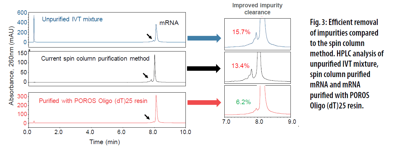 “All of the process-related components are removed with the POROS Oligo (dT)25 resin, and we see a significant reduction in product-related impurities,” continues Flook. “This means our affinity resin does a much better job of removing non polyA species than reverse phase.” All remaining product-related impurities are polyadenylated, as expected.Overall, the POROS Oligo (dT)25 resin demonstrated efficient elution at different load concentrations and excellent recovery with high purity regardless of sample type.
