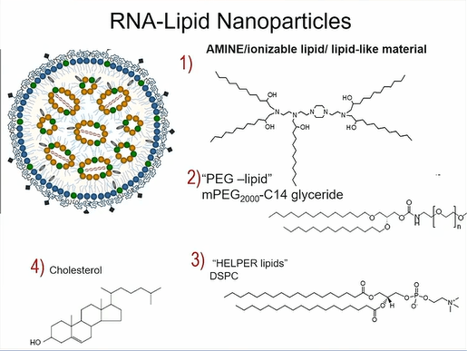 Dr. Daniel Anderson started his talk by discussing the first RNA nanoparticle developed by Alnylam which was approved for a liver disease by FDA in 2018. He presented some examples of FDA-approved lipid nanoparticles that share some compositional similarities. They are typically composed of four lipids and RNA which constitutes the workhorse of the RNA delivery. RNA-Lipid nanoparticles (LNPs) typically have an amine containing lipid or ionizable lipid as the most essential component. It serves as a method of complexing nucleic acids to self-assemble these nanoparticles and facilitate specific association with proteins that can take roles in certain tissue tropism and endosomal escape. Other components such as PEG lipids providing colloidal stability, phospholipids and cholesterol enhancing assembly and endosomal escape are also helpful.