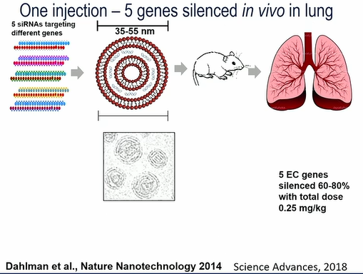 Polymer nanoparticles (PNPs) containing an amine containing polymer instead of ionizable lipid offer an alternative to LNPs. He shared a prior study published in Nature as an example of another organ targeted by LNPs. In the study, they injected PNPs containing five different siRNAs into mouse models to knockdown five corresponding genes. The study has indicated that it is possible to make a NP targeting lung rather than liver, and this technology is suitable for multiplexing. This leads to the concept that multiple RNAs interacting with multiple pathways could be effective in complex diseases such as cancer. He also shared example data from studies where leukocytes and stem cells have been targeted.