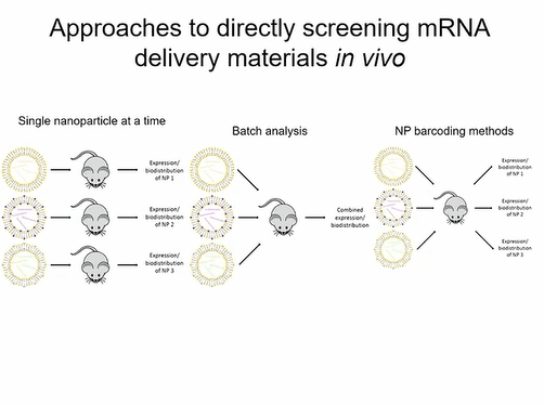 Dr. Anderson went on to discuss methods to identify good levels of RNA delivery. It is possible to inject one NP or multiple NPs at a time. A single NP system might be challenging when the number of NP to try is high and batch method requires narrowing down the candidates to identify which collection works better. However, NP barcoding methods use various NPs that were labeled at the same time. Although it is a powerful strategy to see where the different LNPs end up by looking at DNA barcodes, it does not solve main problems in the identification of the function of mRNA load because the final destination might not be where the optimal function is achieved. Therefore, they tried to develop a parallel barcode system to quantitatively measure different transcripts in a single animal by encoding different proteins in conjugation with different tags separated by a cleavage site. Following peptide cleavage, they analyzed LC-MS data to compare relative abundance. Dr. Anderson presented their data showing that there was a correlation between the amount of mRNA in LNPs and proteins expressed.