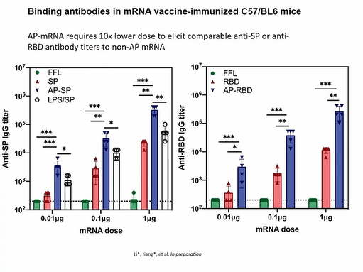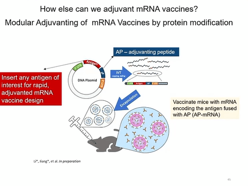 To conclude, Dr. Anderson underlined the high potential of RNA LNPs in genome editing and vaccine development. They delivered Cas9 mRNA using LNP and control AAV and indicated that non-viral delivery of Cas9 via LNPs were comparable to the best AAV mediated delivery system. He also mentioned the efficiency of nebulization as an alternative route to deliver mRNA NPs into the lung. These nebulized biodegradable LNPs performed better than the early polymer systems and displayed durable expression of mRNA in the lung. Dr. Anderson ended this talk with the potential of mRNA NPs in vaccine optimization. They again constructed a library of ionizable lipids, tested them and identified the ones displaying high levels of RNA delivery and expression. They noticed that the lipids themselves could act as adjuvants and Dr. Anderson explained this adjuvant effect by saying that some formulations could interact with stimulator of interferon genes (STING). They also discovered that the peptide sequence associated with the antigen of interest could improve immunogenicity. The peptides they called adjuvating peptide could be conjugated to any antigen and provided significant improvements in the overall antibody titers. He shared the data indicating that lower doses of antigens were required to elicit same level of antibody titers when they were conjugated to adjuvating peptides. Dr. Anderson concluded his talk by sharing that he was optimistic about the methods of adjuvating by either NP itself or with adjuvating peptide sequences to lower the doses of RNA needed and increase overall efficiency.